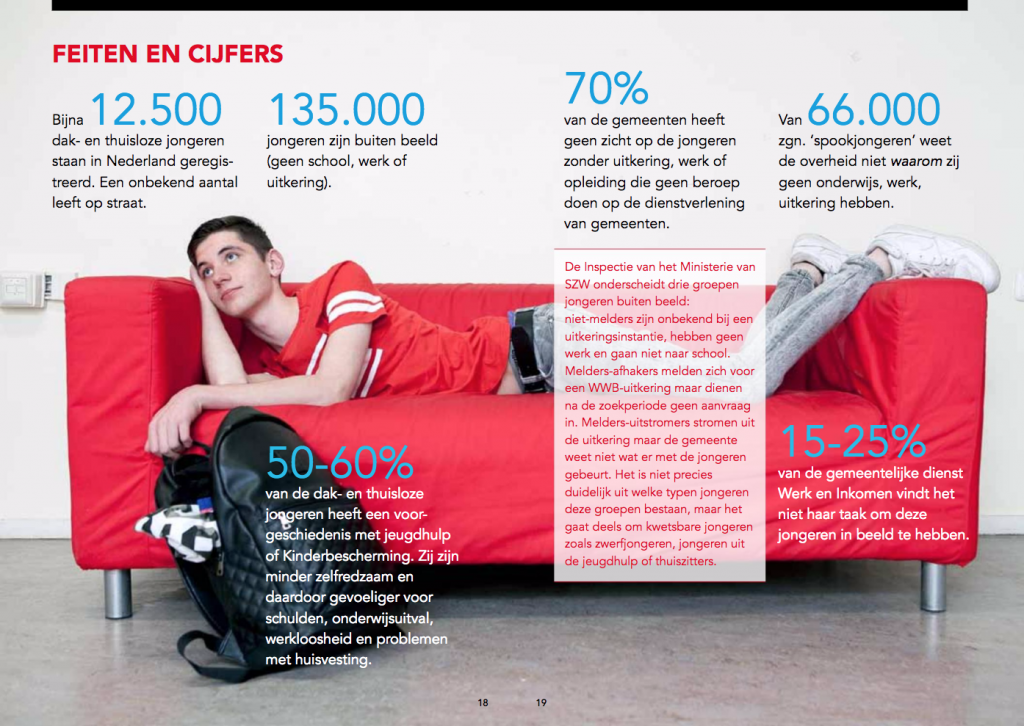 Nederland telt ruim 12.000 dak- en thuisloze jongeren, waarvan er bijna 8.700 tussen de 18 en 23 jaar oud zijn. Vaak hebben zij een verleden in de jeugdzorg (jaarlijks verlaten 20.000 jongeren op hun 18de jeugdzorg). Veelal zijn ze nog niet klaar om hun leven zelfstandig vorm te geven, hebben ze weinig inkomsten, geen opleiding of werk en weinig vrienden, maar wel fysieke en psychische problemen en schulden. Soms komen ze in de criminaliteit terecht.